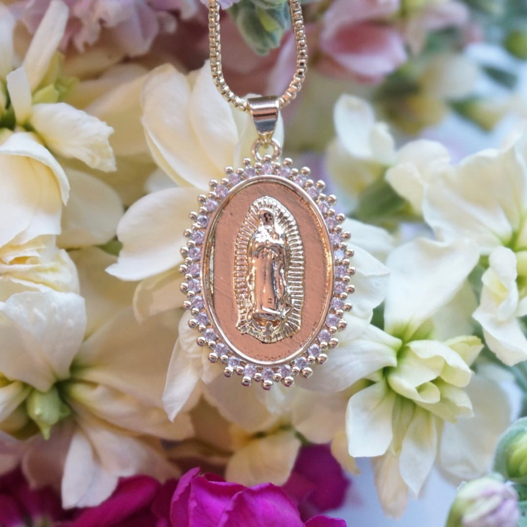 This gold-plated necklace features a Box chain with a Virgen de Guadalupe pendent with a halo of CZ Stones.