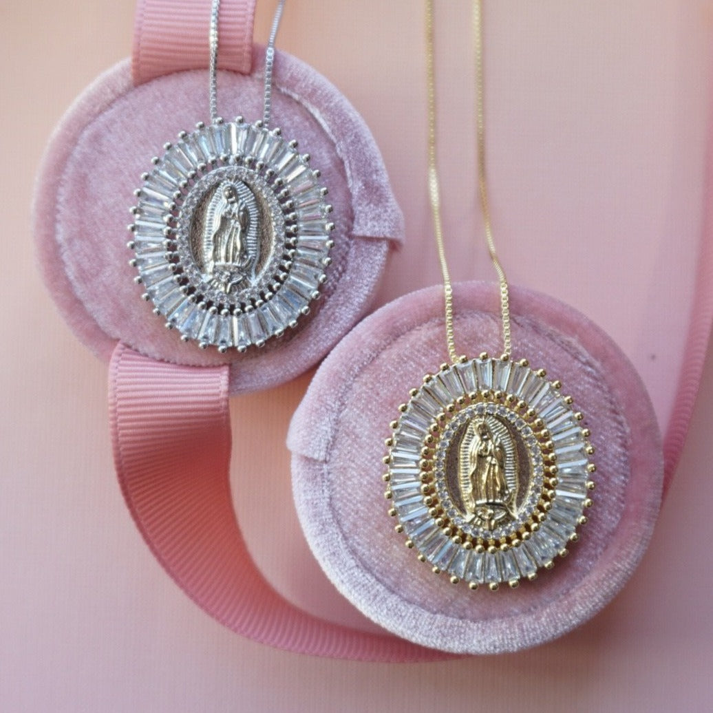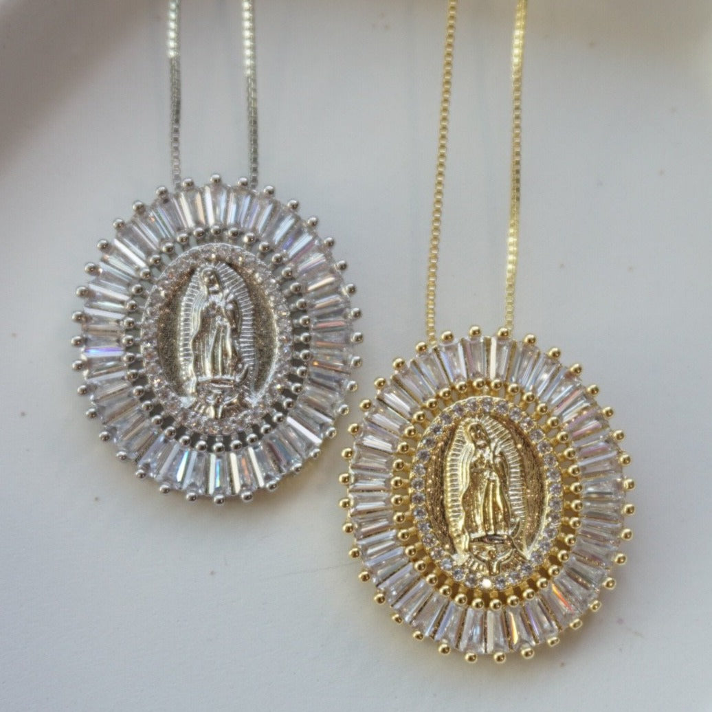 Look amazing with our gold plated VM necklace! It features a Gold Plated Virgin Mary pendent surrounded by radiant clear stones.